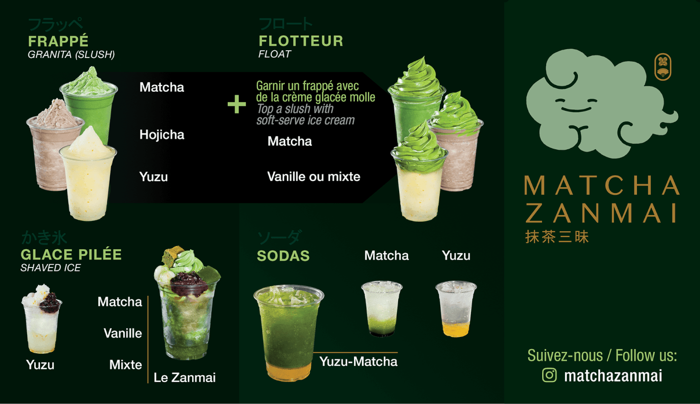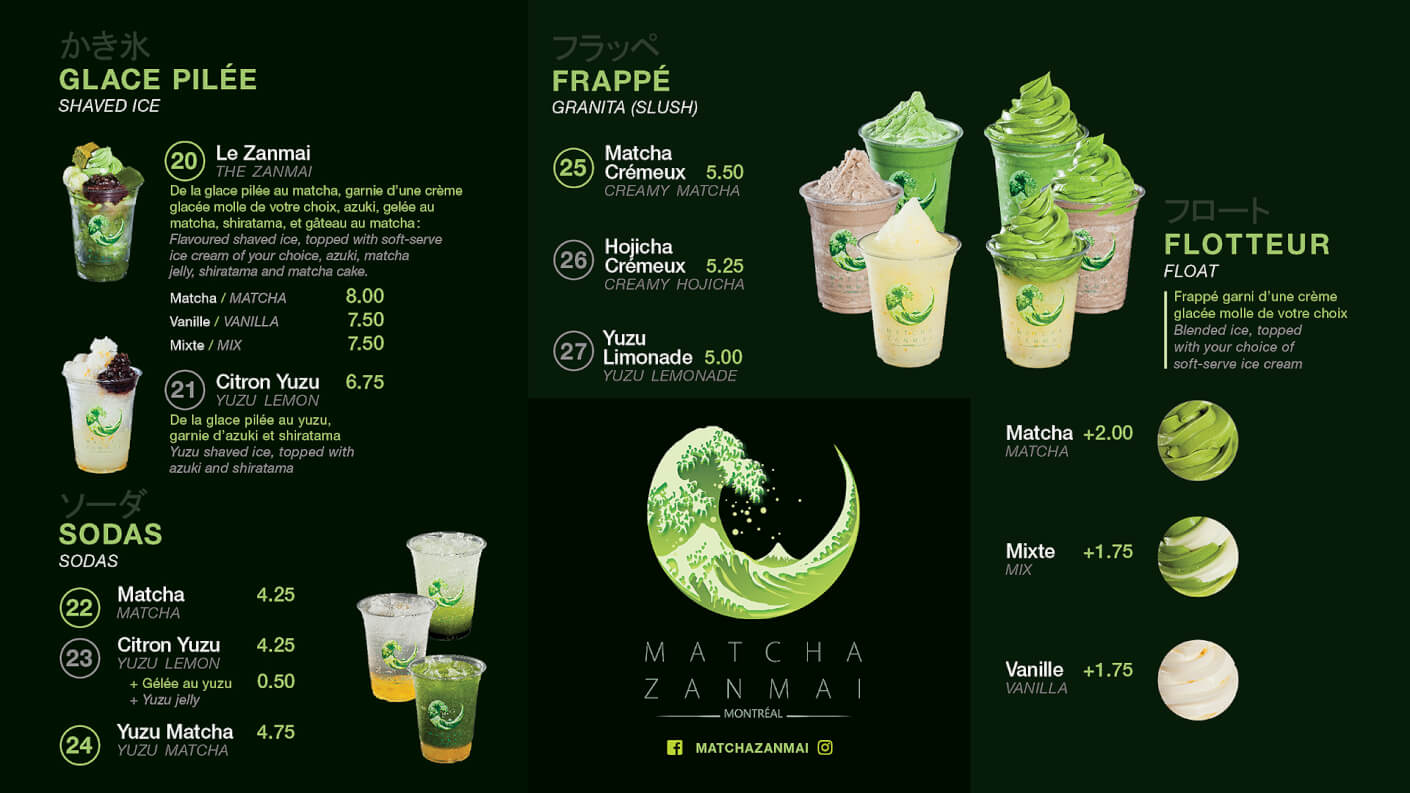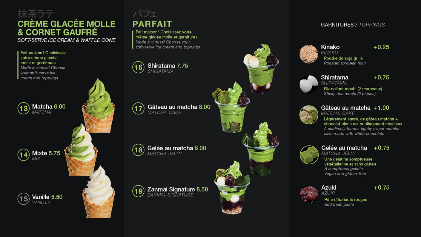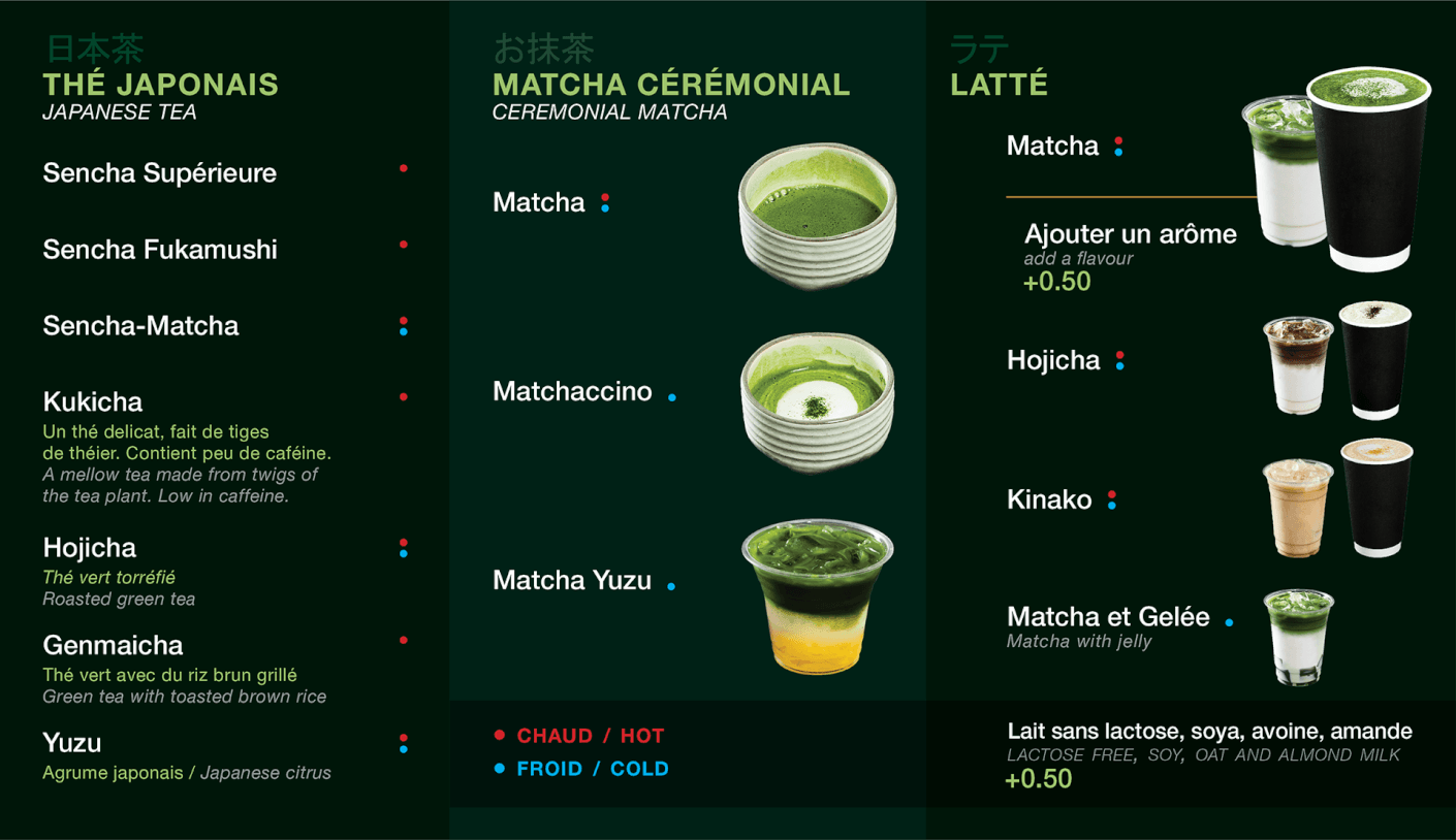 Le premier menu pour comparison. On a fait un approche plus minimaliste (en haut) quelques années apres le lancement, une fois que la majorité de clients connait très bien le matcha et les produits. Ce fut un amélioration de lisibilité sur les écrans.